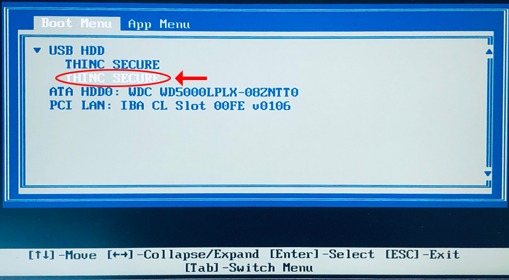 - On selecting the USB Drive as the bootable priority, the ThinC-COMPUTE will display two secure partitions in the name of “ThinC Secure”. User should select the second or bottom partition from the list.