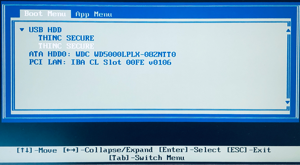 - From the Boot menu, choose the ThinC-COMPUTE visible as ThinC USB Storage/ThinC USB Hard disk/Linpus Lite USB as boot device. If the PC/laptop boots to the original operating system, reboot the PC/laptop and try once again.
